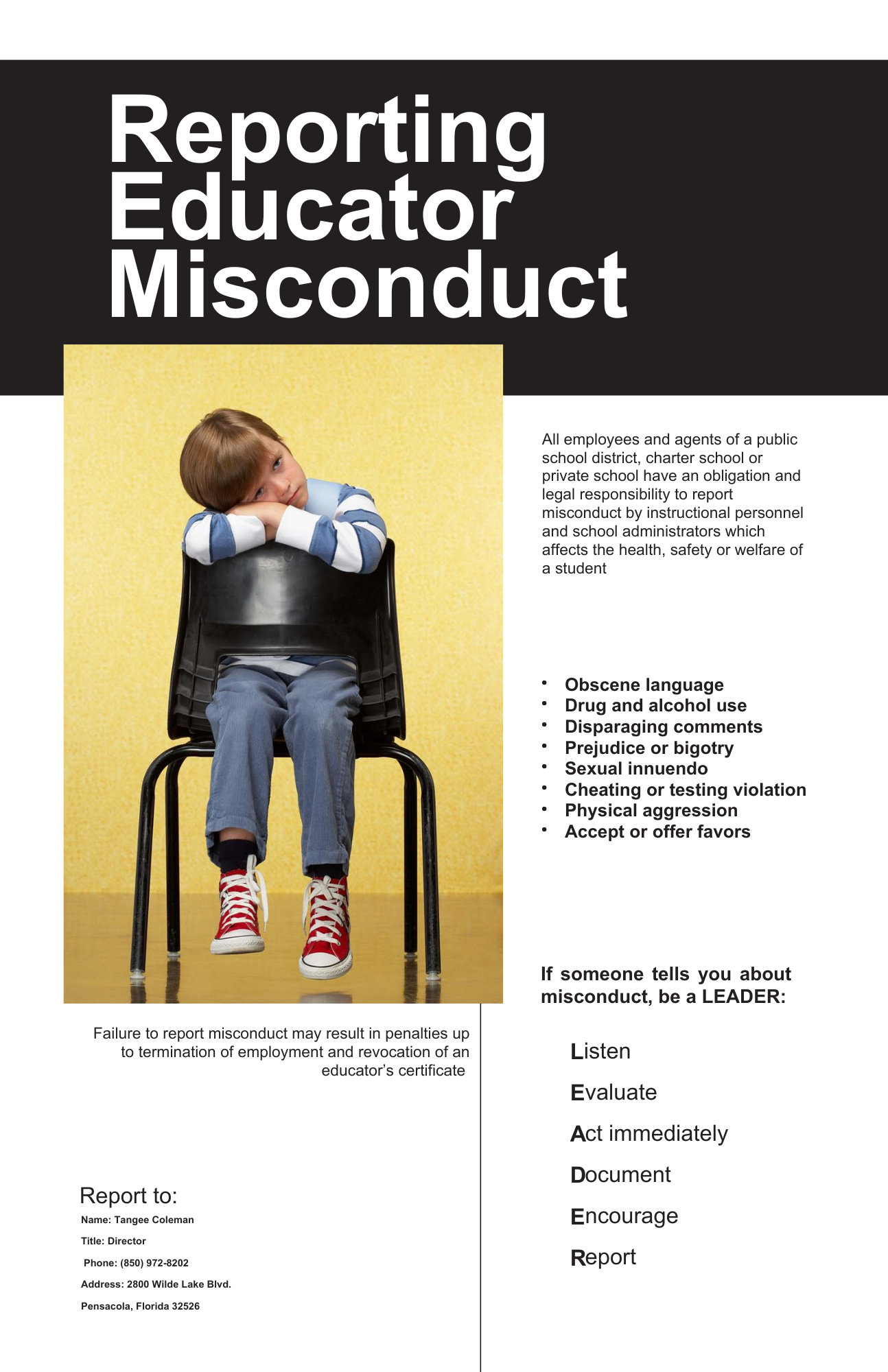 All employees have a responsibility to report any misconduct by instructional staff or school administrators that jeopardizes the health, safety, or welfare of students. This includes behaviors such as inappropriate language, substance abuse, discriminatory comments, sexual innuendos, academic dishonesty, physical aggression, and accepting or offering favors. Concerns about employee or administrator misconduct should be reported to the Head of School, Tangee Coleman, at 850.972.8202. Any credible allegations of misconduct involving certified educators will be reported to the appropriate oversight agency. Detailed procedures for reporting such conduct can be found in the Main Office and on our school’s website.
